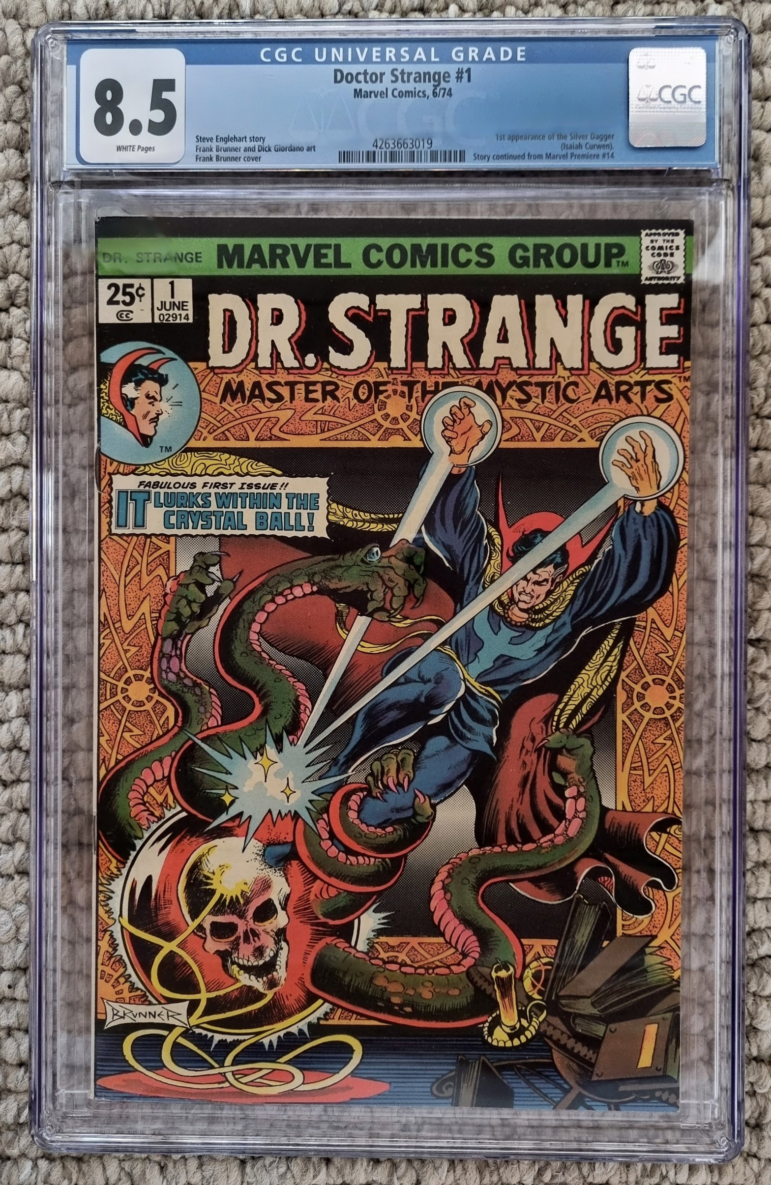 1st Silver Dagger. Iconic cover and art by Frank Brunner and Dick Giordano. Published June 1974 by Marvel. CGC 8.5 VF+ white pages.